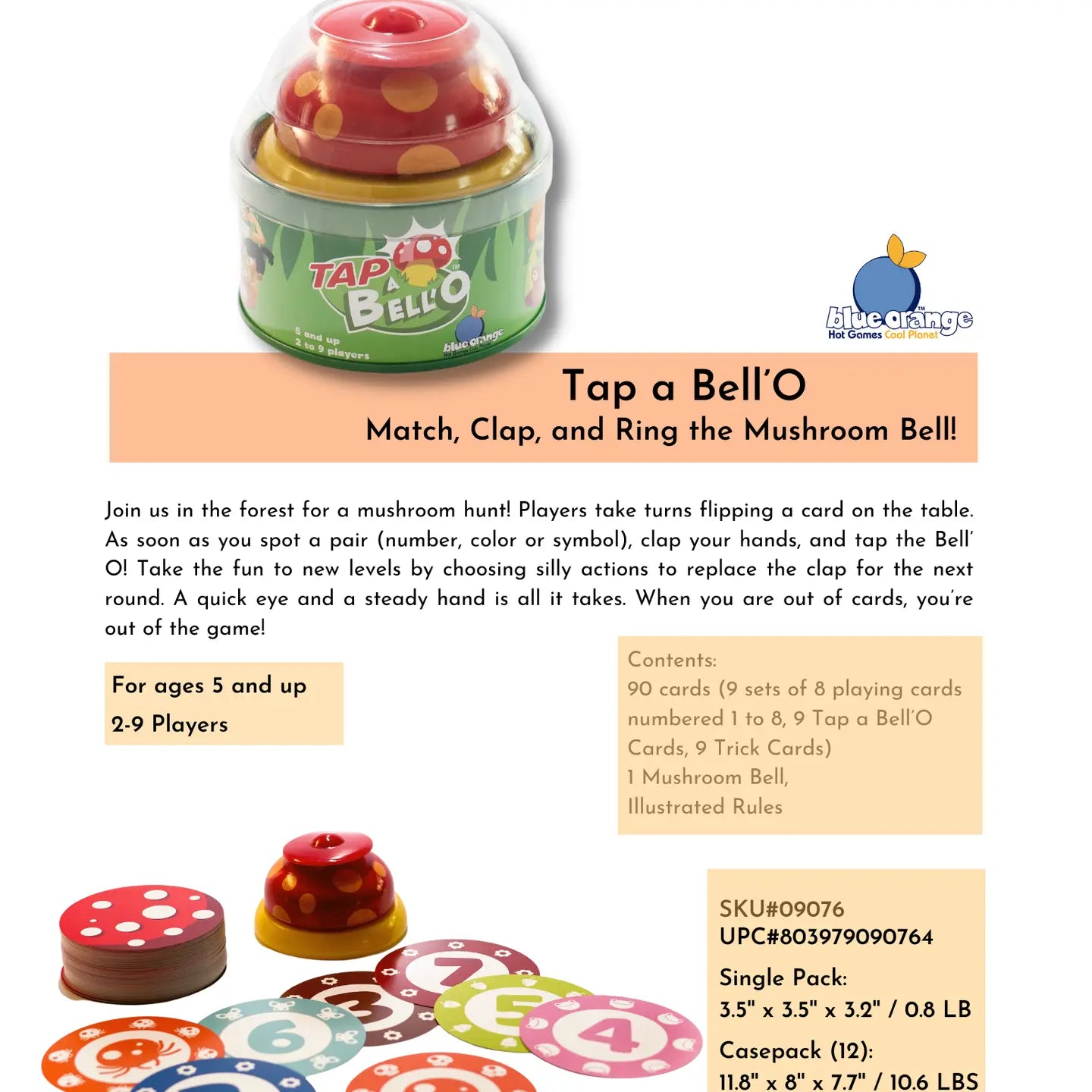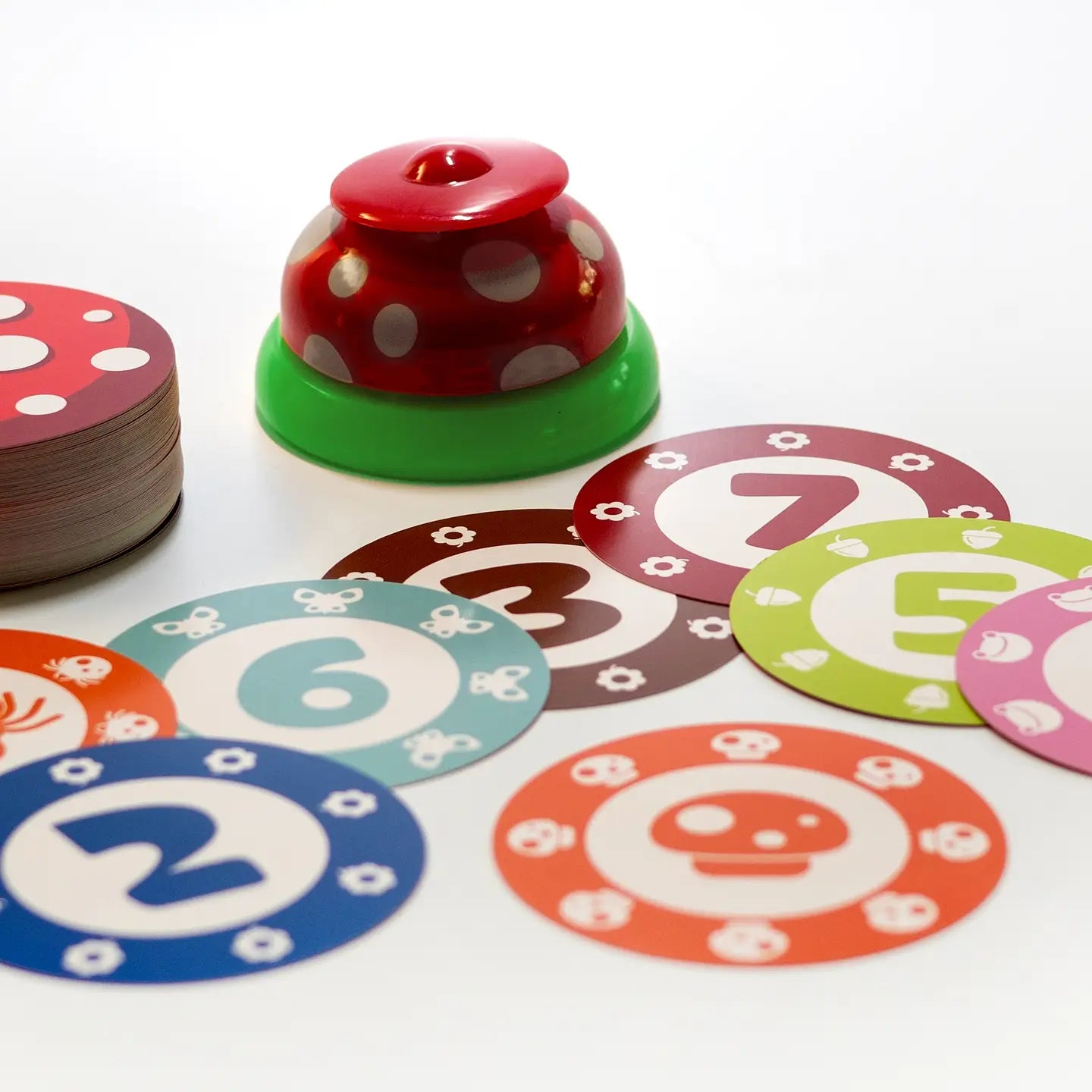As soon as you spot a pair (number, color or symbol), clap your hands, and tap the Bell'O! Join us in the forest for a mushroom hunt! Players take turns flipping a card on the table. As soon as you spot a pair (number, color or symbol), clap your hands, and tap the Bell’ O! Take fun to new levels by choosing silly actions to replace the clap for the next round. A quick eye and a steady hand is all it takes. When you are out of cards, you’re out of the game! As soon as you spot a pair (number, color or symbol), clap your hands, and tap the Bell'O!