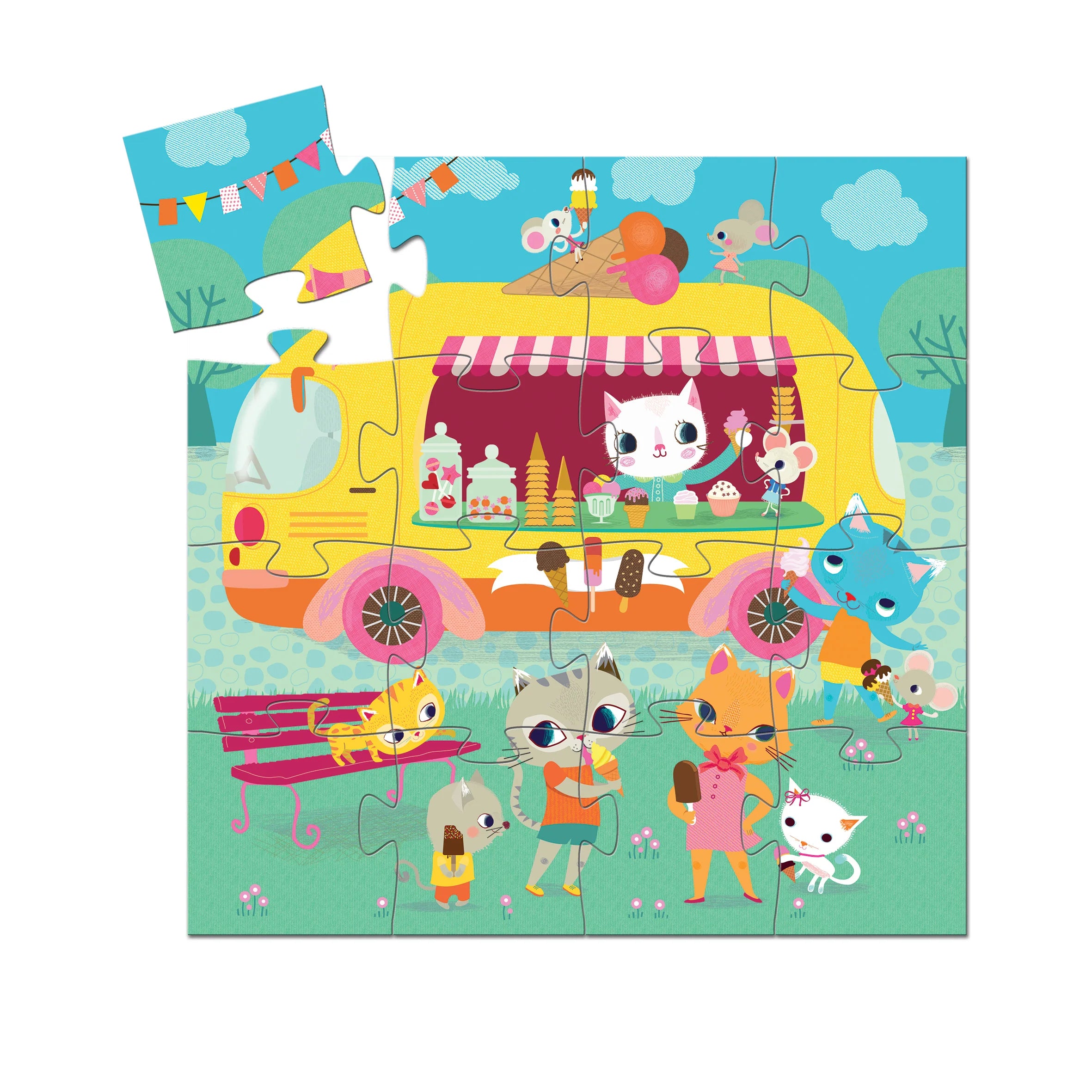 I can hear the bells from here! Let's rush over to the ice cream truck and get our favorite flavor. Packaged in a box-shaped like a classic ice cream food truck it has a moveable ice cream cone on the top; each puzzle is 10 x 10 inches.