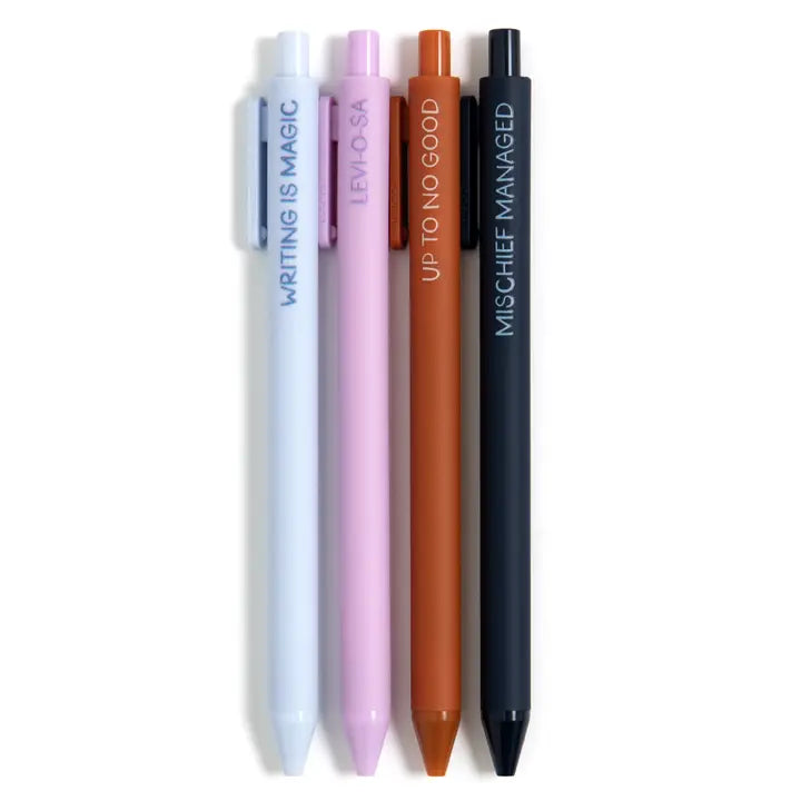 Features: 4 click-style gel ink pens Ink colors: Light Blue, Lilac, Rust, Navy Size: Package - 6”×2.25×0.4” Design: Writing is Magic, Levi-O-Sa, Up To No Good, Mischief Managed