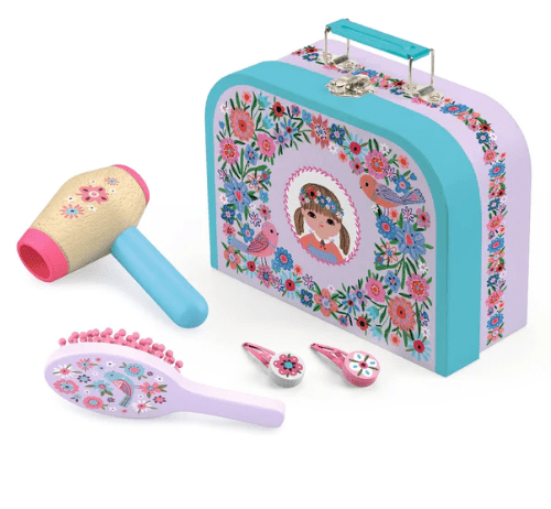 Contents: 1 cardboard case with handle and 1 interior mirror, 1 pair of hairdressing scissors, 1 brush, 1 comb, 1 hair dryer, 1 set of straighteners, 2 hair clips, 3 hair bands, 2 clip-in braids, 1 card.