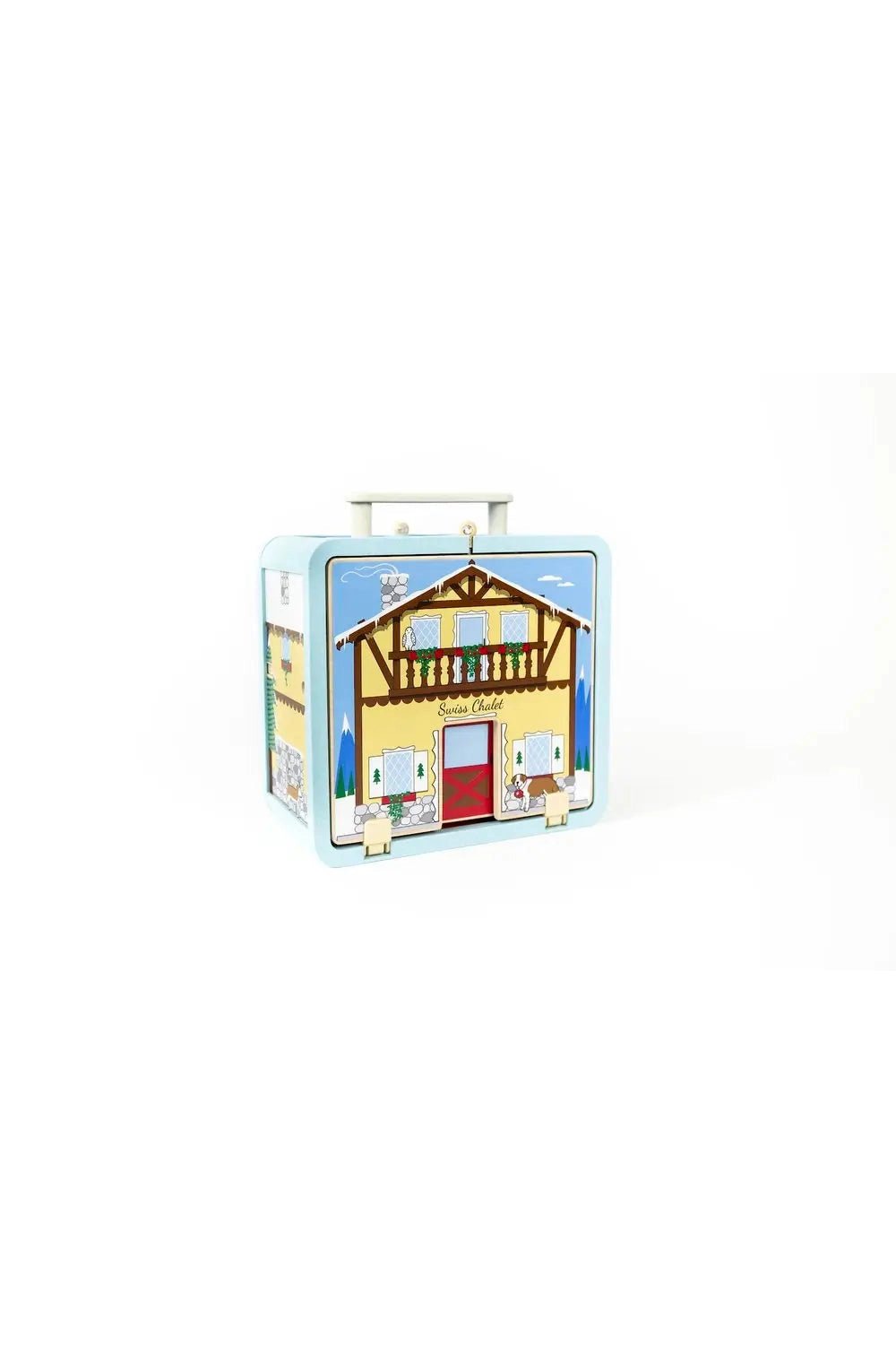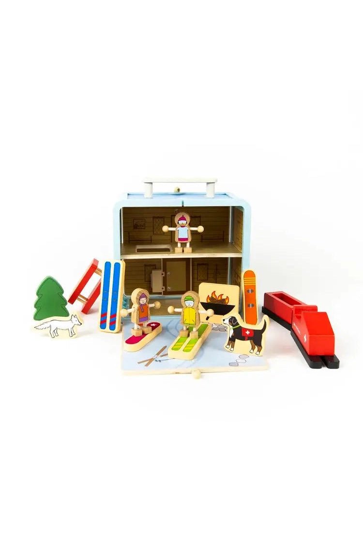 Suitcase Series allows for portable play. Each suitcase opens up on both sides to reveal a world of fun. The 14-piece Ski Chalet has everything for hitting the slopes and après-ski, including snowboards, rescue dog, and fire pit.