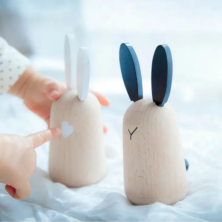 A cute pair of wobbly wooden rabbits. Gently push the rabbit to create a mesmerizing swaying motion and a calming bell chime sound which will help baby to relax into a nap…? Check out the unique little trade mark dots above the bunny’s tail- modeled on Kiko+gg's real in-house pet rabbit Mochi!