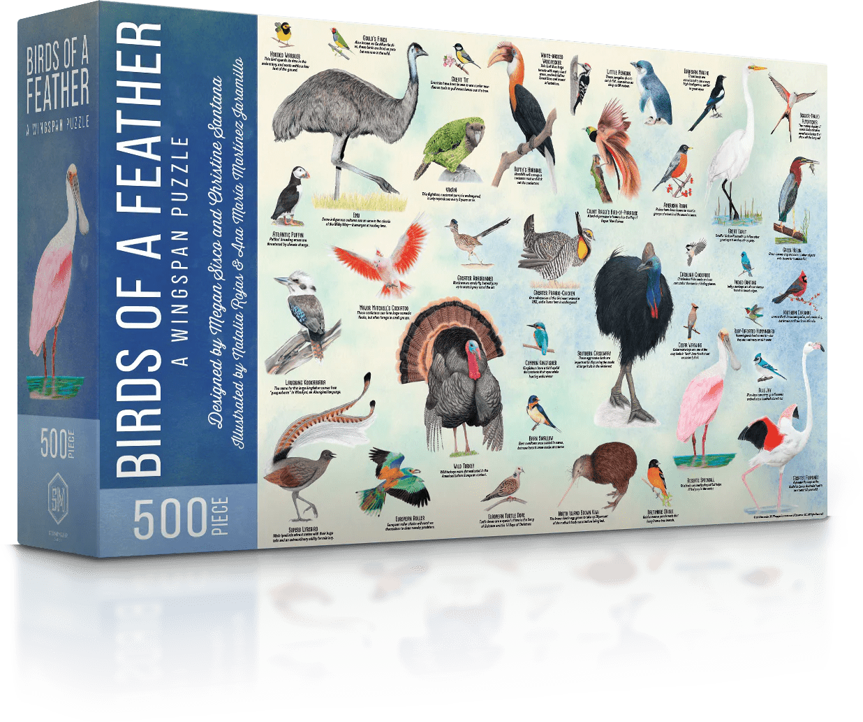 • Beginner-level 500-piece jigsaw puzzle designed specifically for Wingspan by Megan Sisco and Christine Santana,