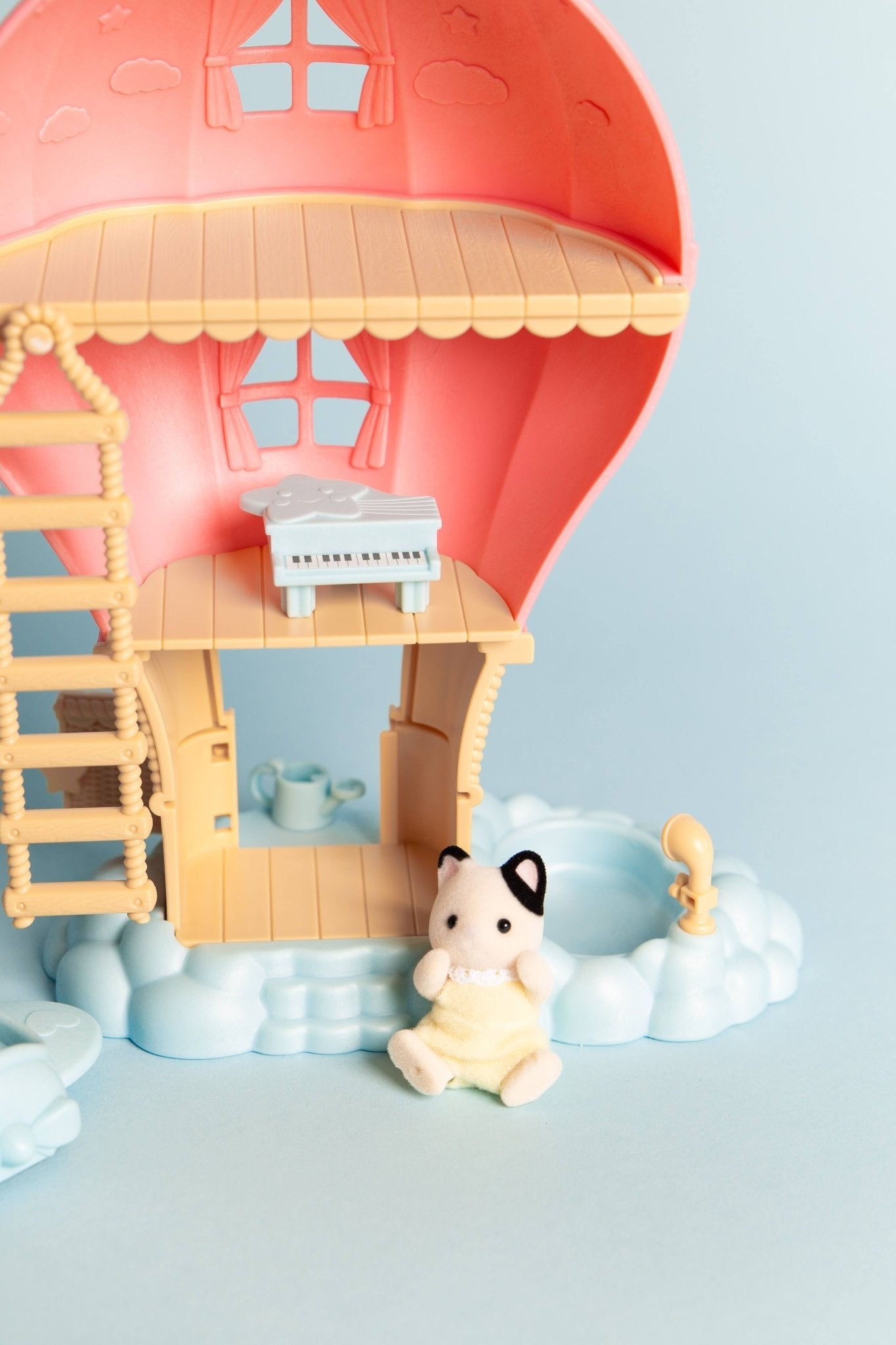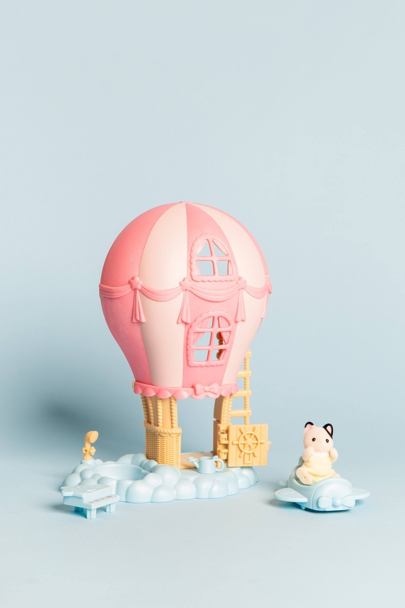 Babies loves to play at the Balloon Playhouse! This fun pastel playset features three stories to play on and includes and airplane bed, toy piano and baby hot tub! Set includes Angelica Tuxedo Cat baby who is poseable and dressed in removeable clothing. Set atop of the Baby Castle Nursery for more fun! Play together with Nursery Series playsets including Baby Castle Nursery, Sunshine Nursery Bus, Baby Windmill Park and more! Box includes Baby Balloon Playhouse.