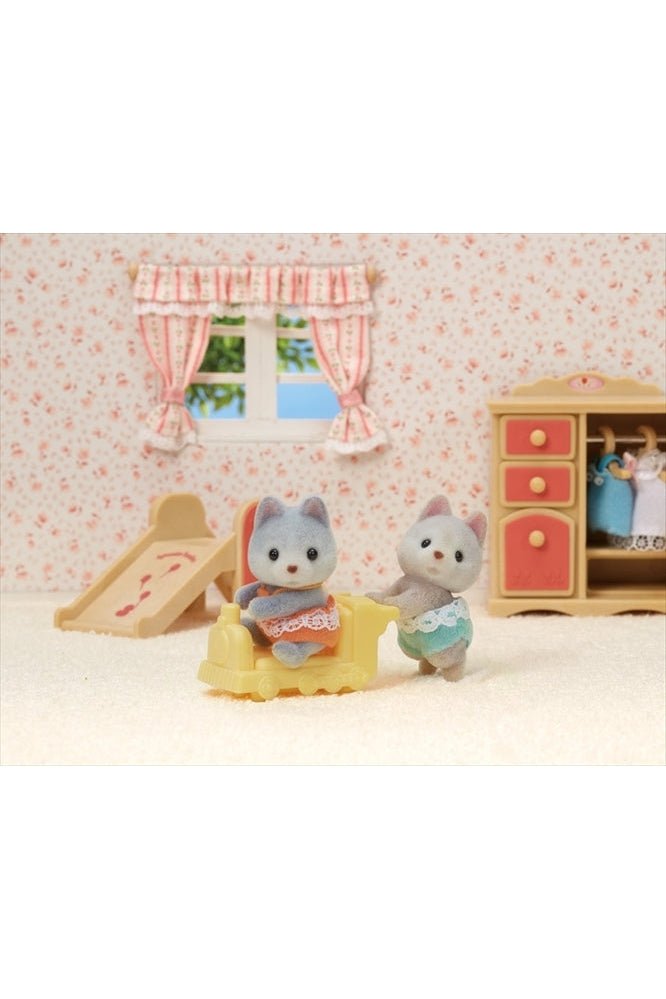 The Husky Twins set contains baby figures Amber (Sitting) and Jeremy (Crawling), along with a pushcart (Train).