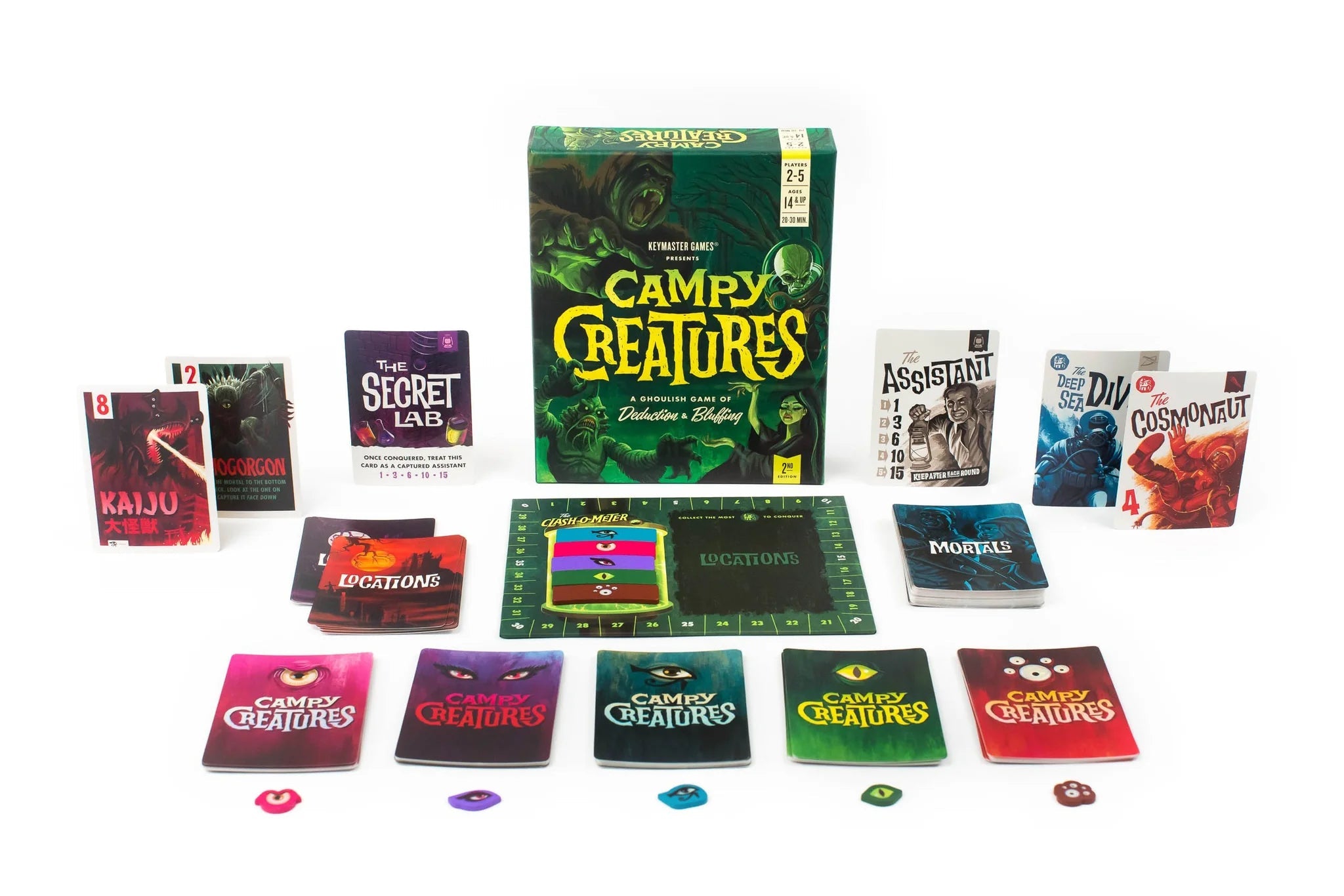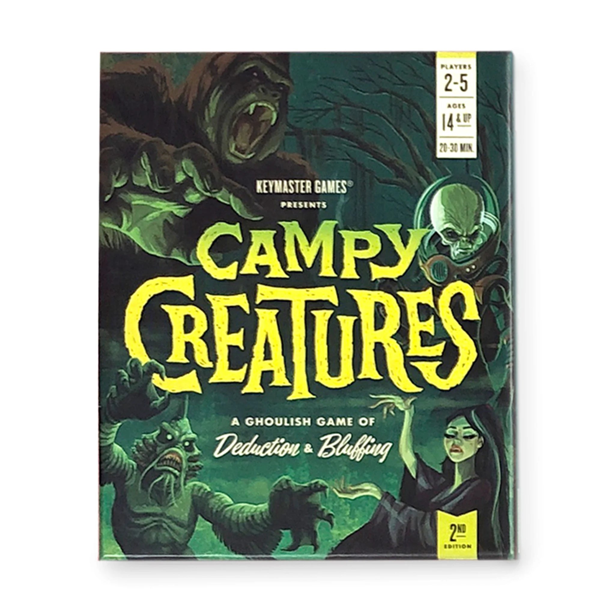 Campy Creatures is a ghoulish game of bluffing, deduction, and set collection for 2-5 players. Players begin each round with the same hand of creatures. Their goal is to capture valuable mortals by outguessing their opponents with the creatures they play. Each player has perfect information at the start, so knowing what a person might do in a particular situation is key.
