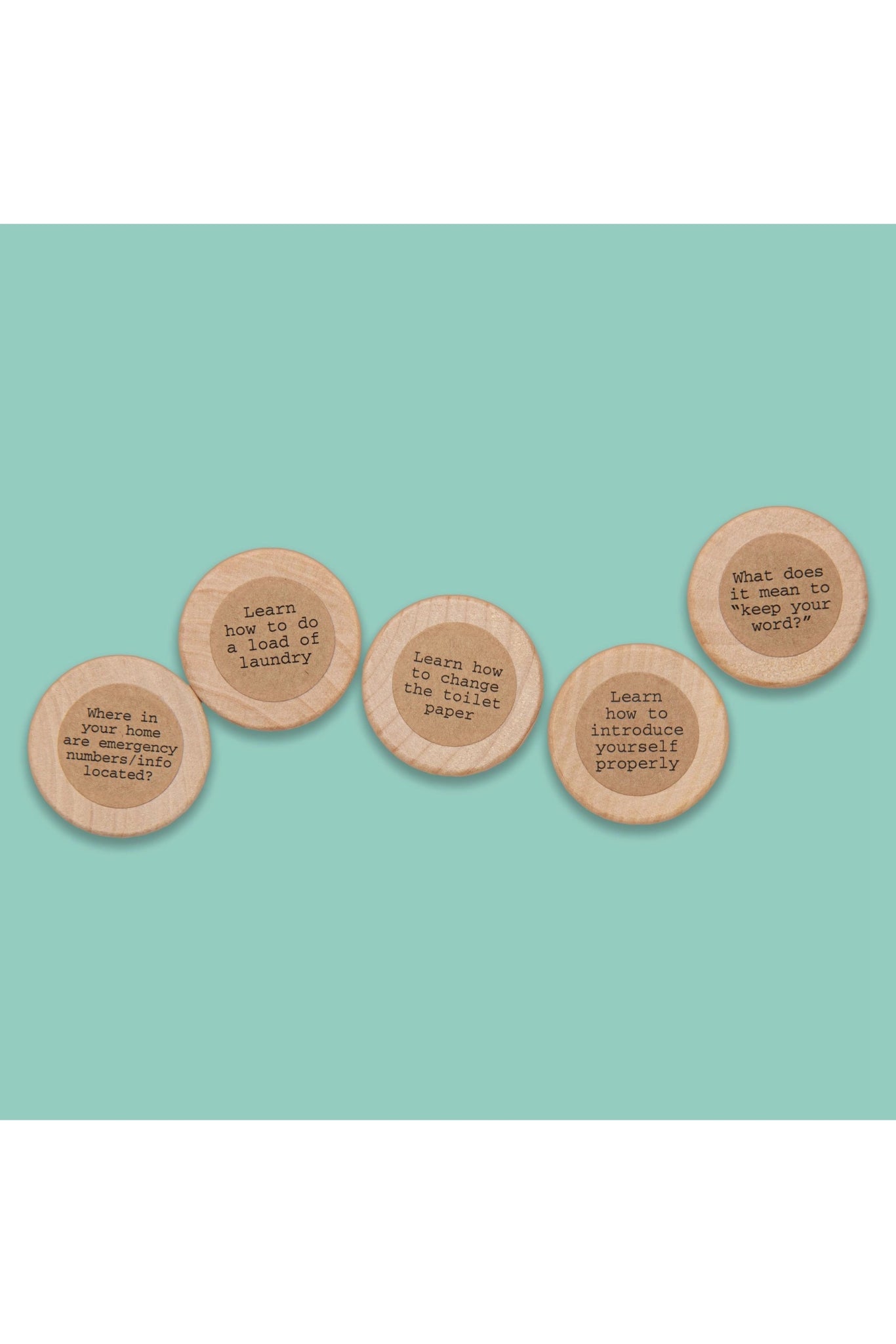 Life Skills- Provides specific, age-appropriate skills and information on wooden coins for your child to choose from.