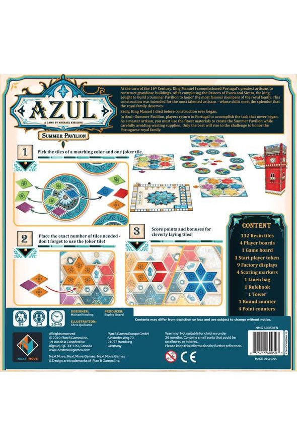 In Azul: Summer Pavilion, players return to Portugal to accomplish the task that never began. As a master artisan, you must use the finest materials to create the summer pavilion while carefully avoiding wasting supplies. Only the best will rise to the challenge to honor the Portuguese royal family.