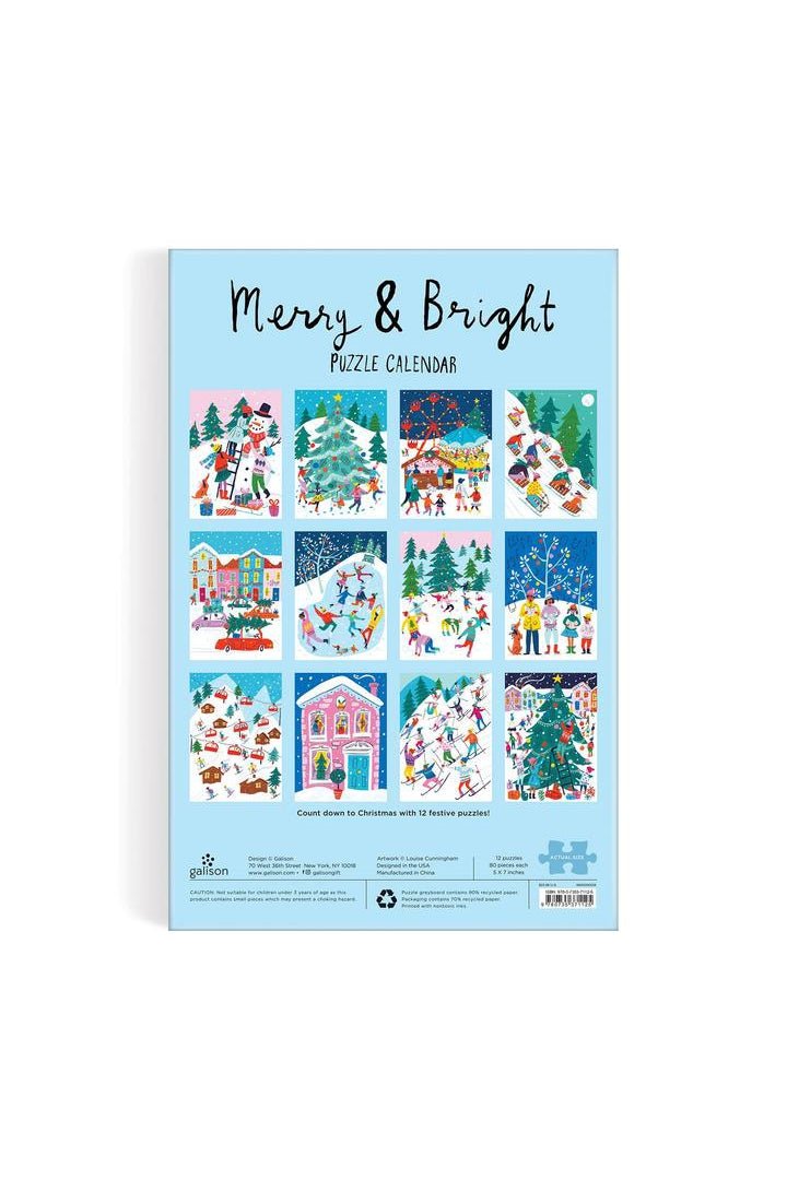 The Louise Cunningham Merry and Bright 12 Days of Christmas Advent Puzzle Calendar from Galison captures the spirit of the holiday season with twelve whimsical illustrations; one each on twelve 80-piece puzzles. One puzzle a day for the 12 days of Christmas. Galison puzzles are packaged in matte-finish sturdy boxes, perfect for gifting, reuse, and storage. Inserts of the 12 full puzzle image is included.