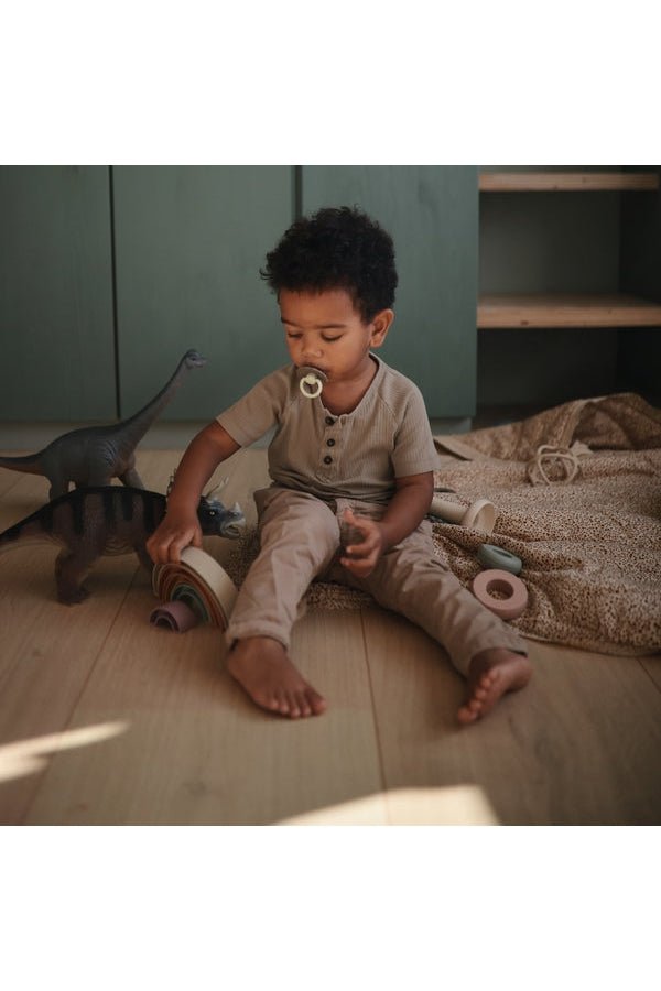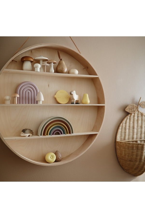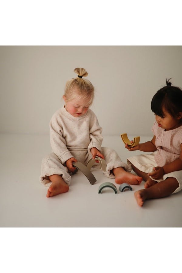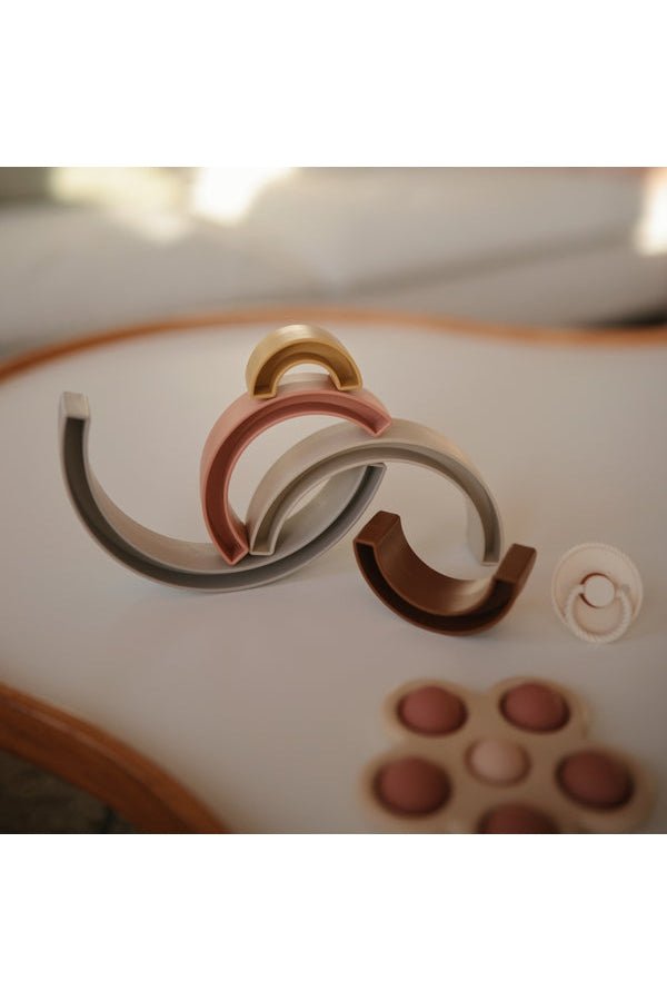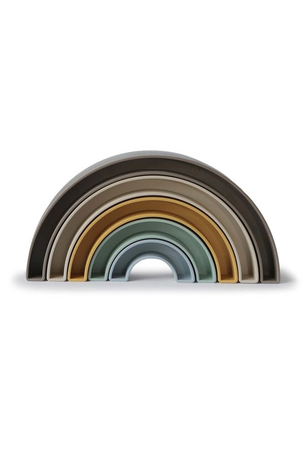 From our Danish hygge collection comes this playful rainbow stacker, inspired by the rainbow skywalk in Aarhus, Denmark. Little ones will sort, stack and play with this beautiful set, all while learning with soft colors and developing their fine motor skills.