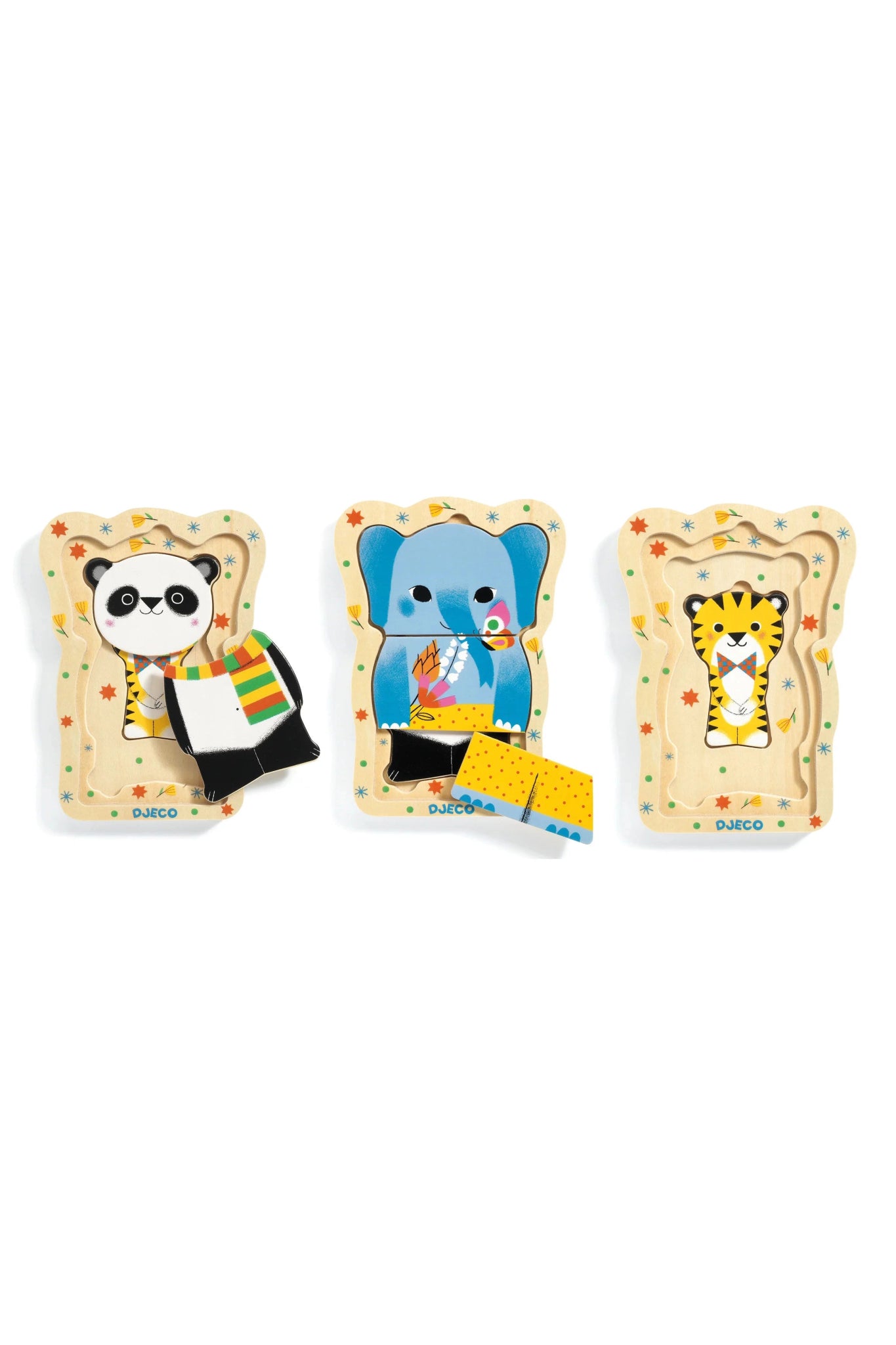 A unique wood puzzle with three levels of play and challenge, fit the 1 piece tiger, 2 piece panda, and 3 piece elephant in the right places on their levels. Encourages skill progression and development, play with the solid wood pieces inside their boards or stand-alone. Helps develop fine motor skills, shape recognition, color matching, visual acuity, and cognitive development
