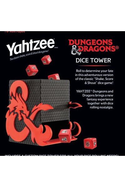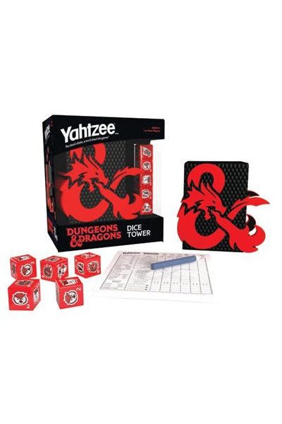 YAHTZEE®: Dungeons and Dragons fires up a bold new spin on America’s #1 dice game with a multi-use, black scaled dice tower with red D&D dragon ampersand and six-sided dice decorated with classic creatures, such as a Dragon, Owl Bear, Gelatinous Cube, and more. Dice tower measures 101 mm H x 75 mm W and fits standard d4 through d20 dice for adventuring in RPGs of any origin!