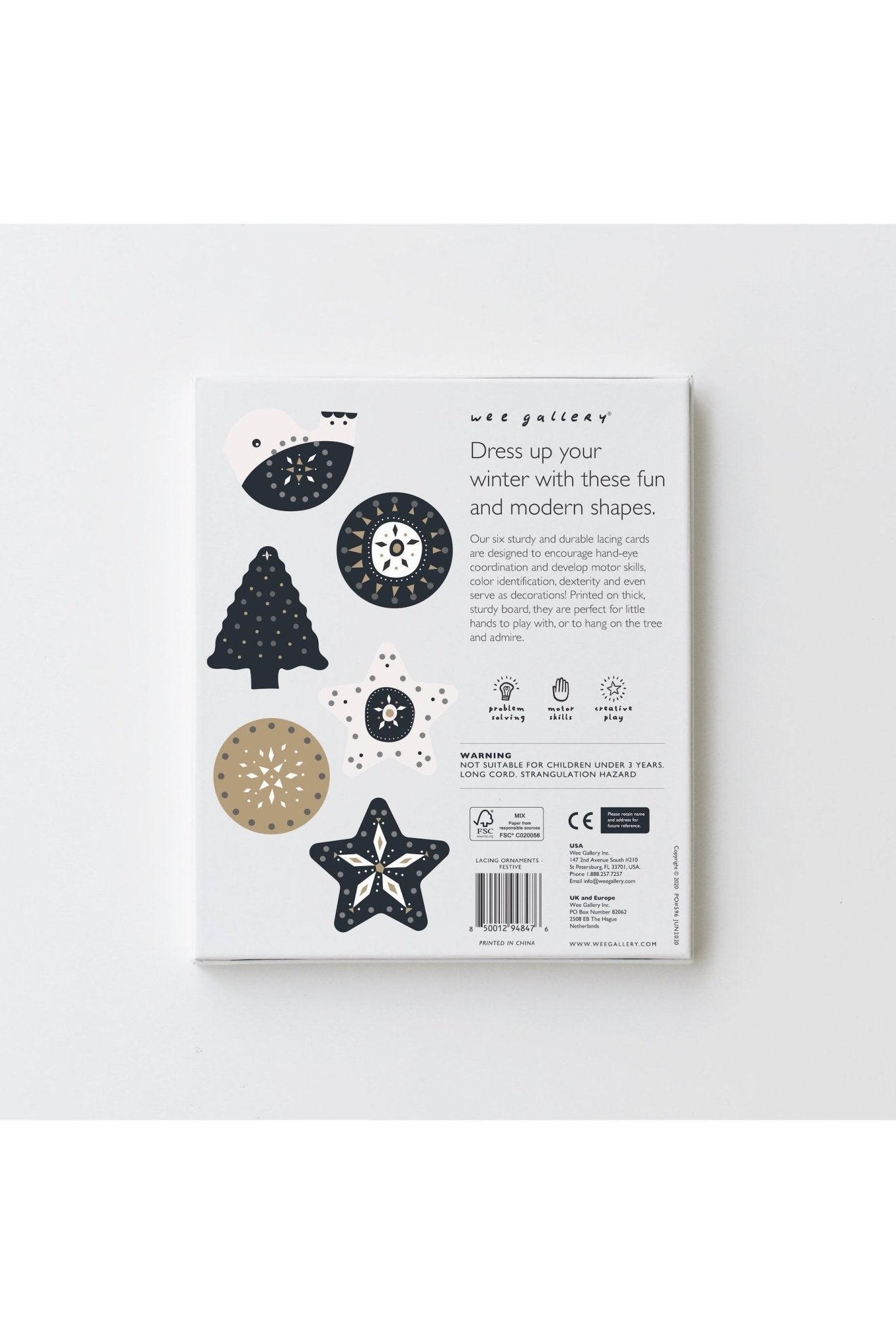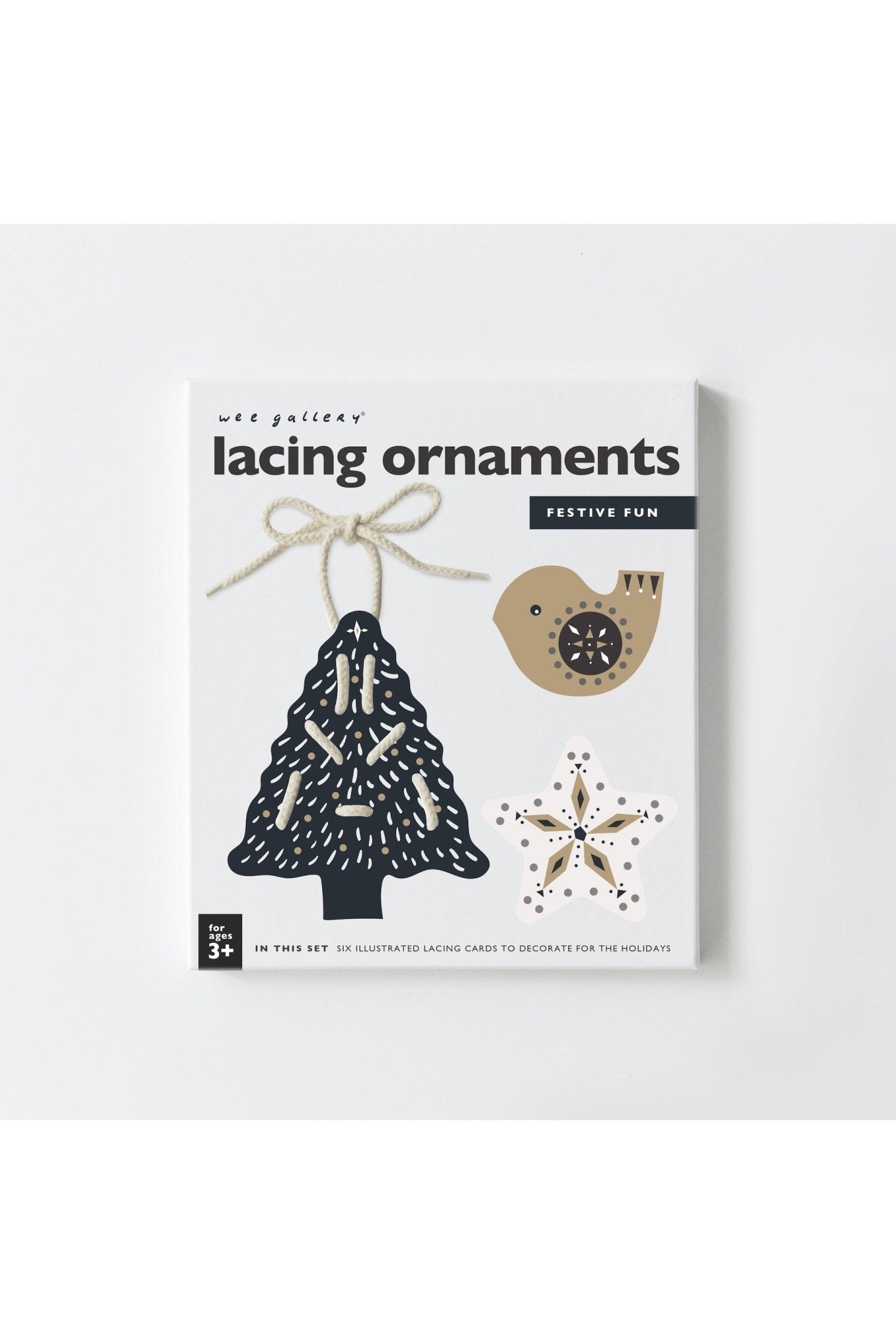 These six sturdy and durable Lacing Cards encourage hand-eye coordination and develop motor skills, color identification, dexterity and even serve as holiday decorations! Printed on thick, sturdy board, they are perfect for little hands to play with or to hang on the tree to admire.