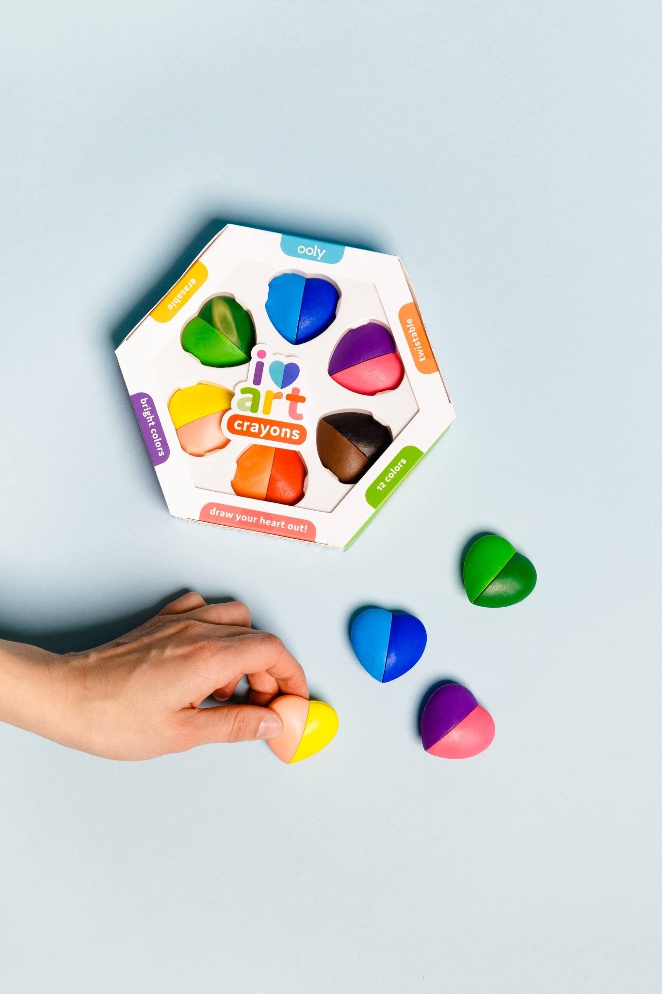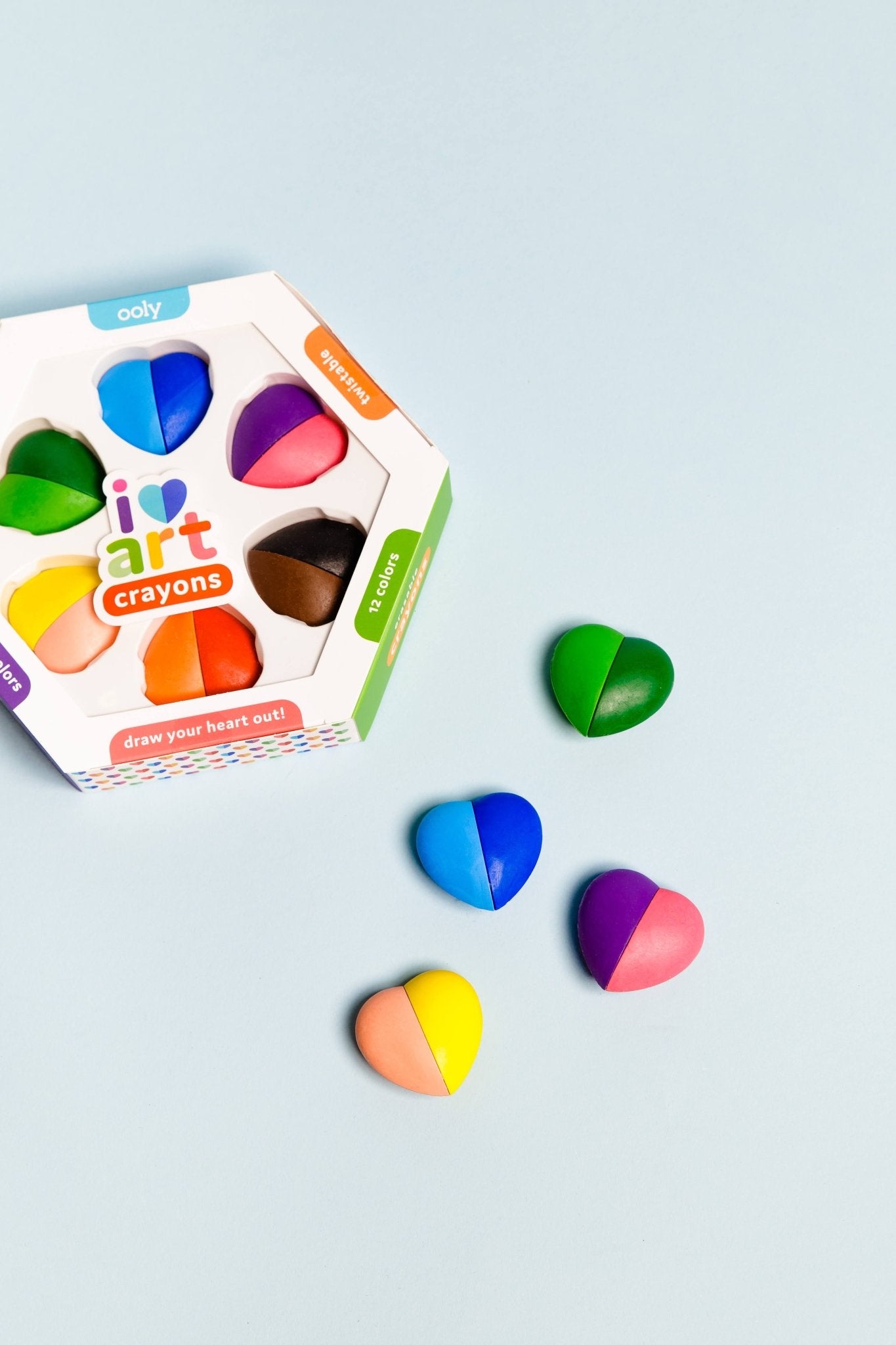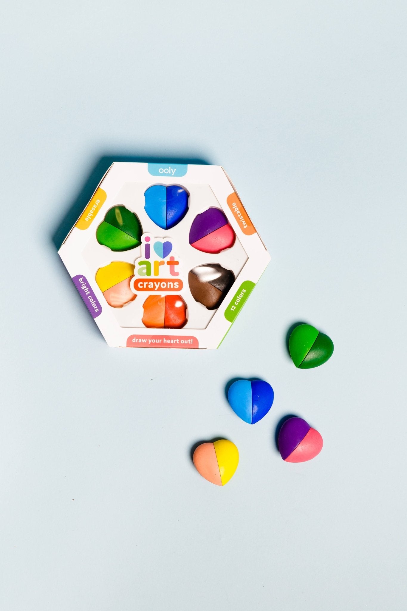 - The I Heart Art Erasable Crayons are brightly colored and shaped into heart-shapes with 2 coordinating colors in each one.