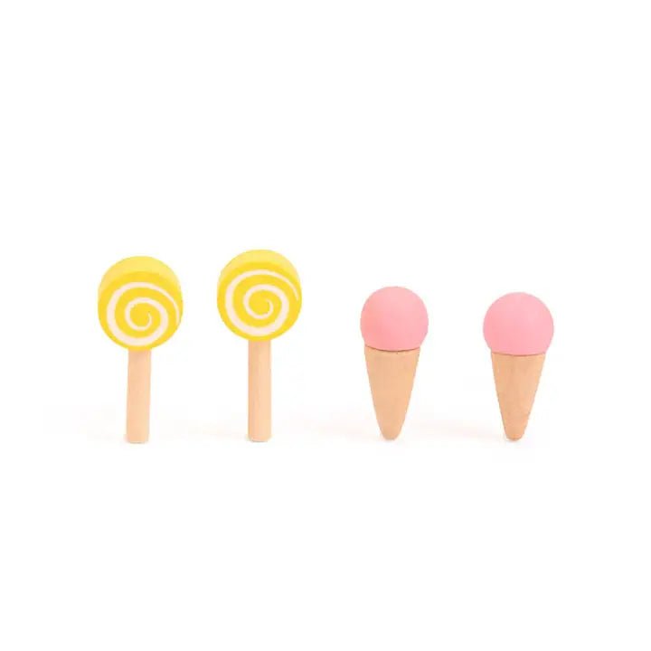 It's summer, it's hot, and Nini the mouse has made ice creams for the big family as a special treat. This wooden set comprises nini, a parasol, 4 ice creams, and an ice cream bike, which opens to keep the ice creams cold!
