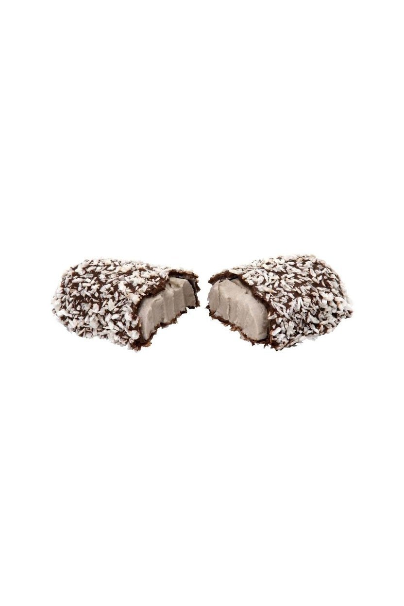 The popular Idaho Spud Bar is a wonderful combination of a light cocoa flavored, soft marshmallow center drenched with a dark chocolate coating and then sprinkled with coconut (Sorry, no potato!). It was originally marketed as a "Healthful" candy bar since it is made with agar agar instead of gelatin.