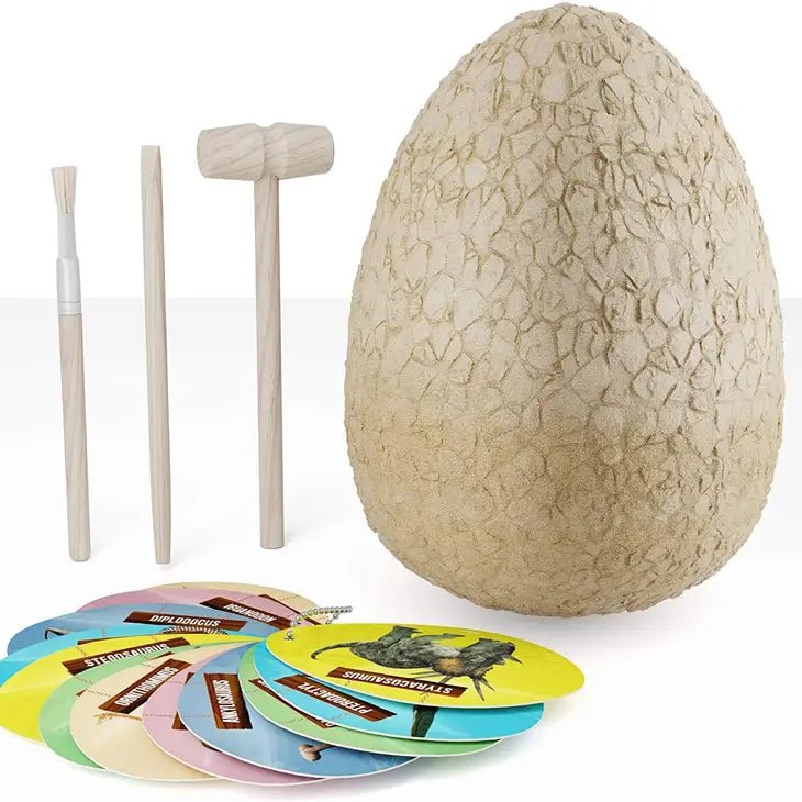 • Kit includes: 1 huge dino egg (over 7 inches long!) (with 12 unique toy dinosaurs buried inside), Chisel, Brush, Mallet, Instruction Guide, and 12 full-colored beautiful learning cards - one for each dino. Includes everything needed for the young scientist to excavate the dinos with ease, and gain a deeper understanding of them.