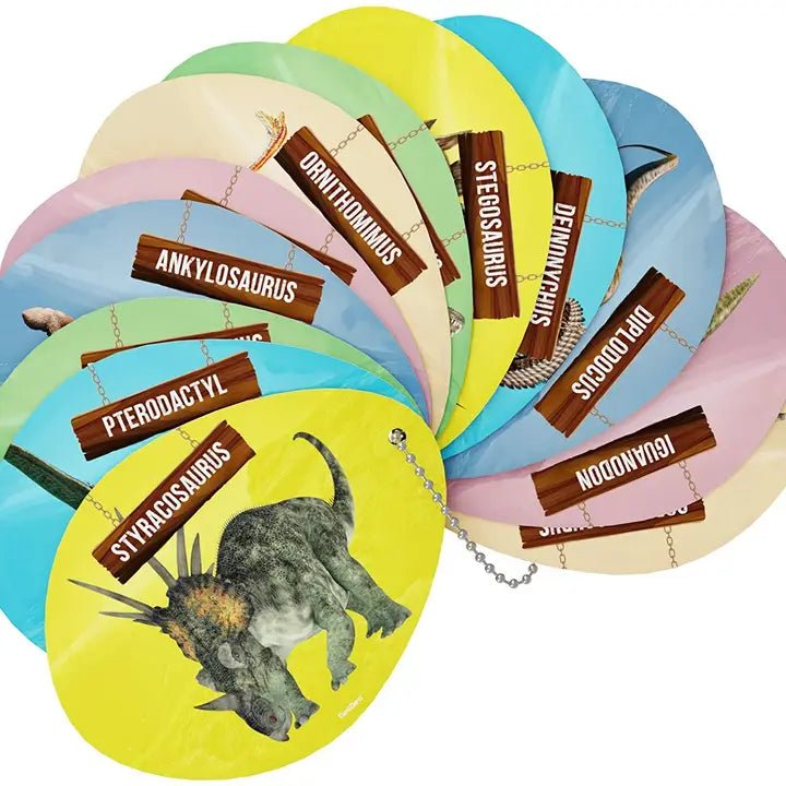 • 12 full-color dinosaur learning cards: Includes 12 beautiful cards on a chain, each describing the history of a different dinosaur. After digging up a dino, try to match up the appropriate card to your dinosaur and learn more about i