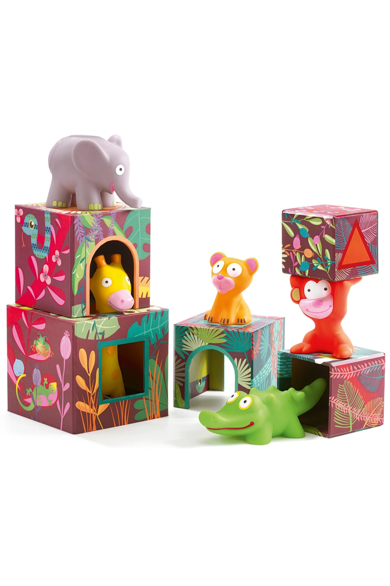 - Contents: 5 cardboard blocks and 5 soft plastic jungle animals (giraffe, crocodile, elephant, monkey, and lion cub).