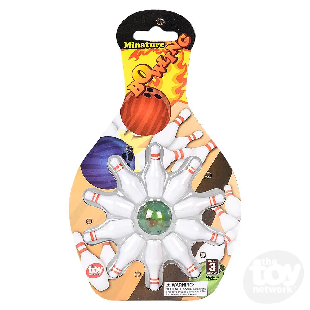 Our Mini Bowling Game is small enough to work on any flat surface. Perfect for any desk or tabletop. Each set comes with 10 pins and a bowling ball packaged in a blister card.