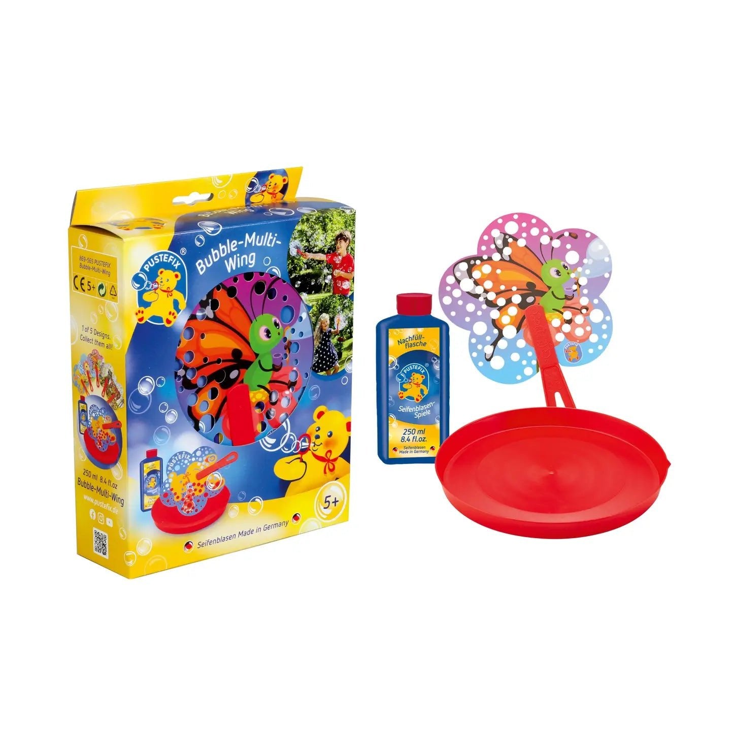 Soooo many soap bubbles to guarantee action-packed days. Immerse he Multi Wing into the bubble tray as the liquid covers the holes in the surface of the fan. Energetically waving the fan produces a flood of tiny bubbles that dance in the air. The pretty, flower-shaped fans are available with five different motifs: Pusti the Bear, a dainty butterfly, a cutesy unicorn and two might dinosaurs.