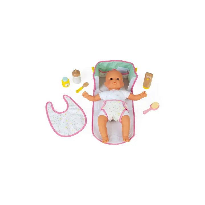 Wooden and fabric toy. 2 years and up Pretty fabric nappy bag containing everything your child needs to take care of their doll: 1 bib, 1 diaper, 1 spoon, 1 brush, 1 small jar, 1 tube of cream, 1 bottle and 2 cotton pads.