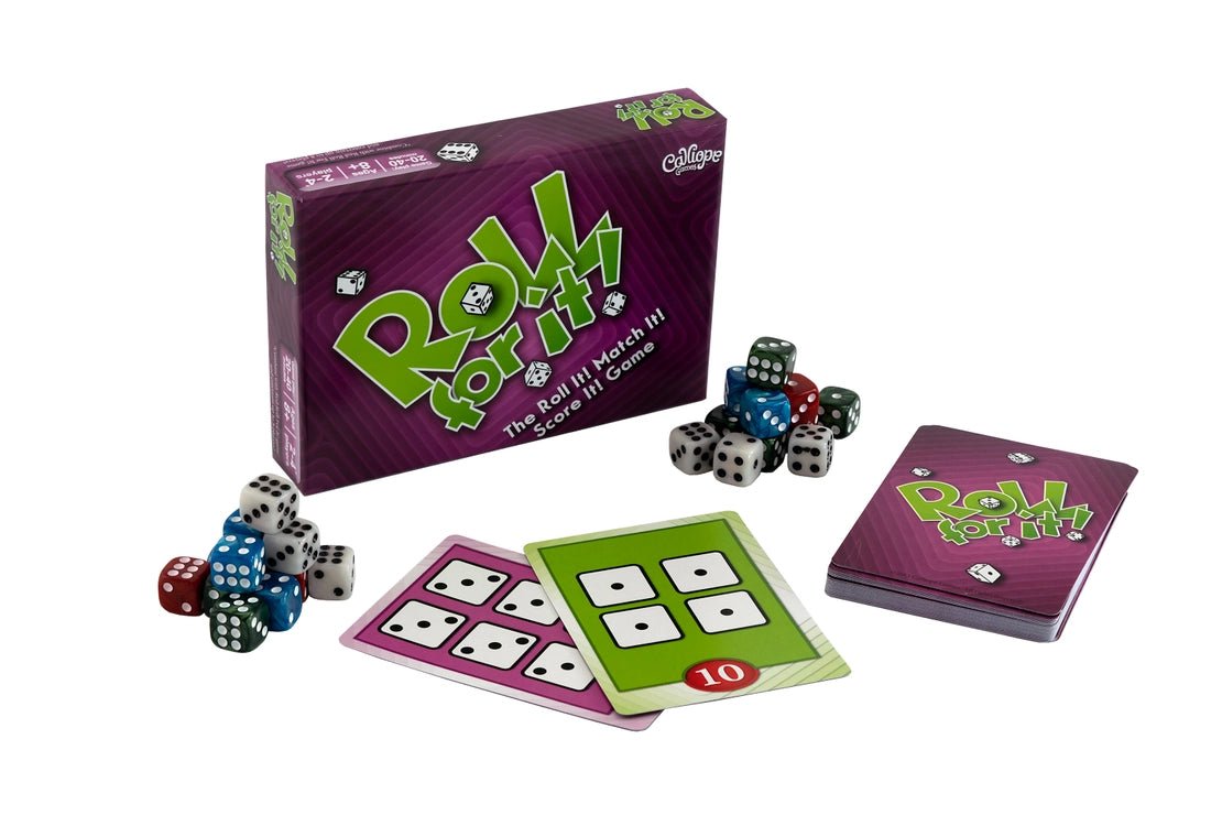 Roll For It! is everything you want in a game. It’s fun, it’s easy, and it’s fast! The rules are simple: Roll your dice, match a card, and score some points! Be careful, though—other players may challenge you for the card you’re after. The first player to collect 40 points wins! Roll For It! is the perfect travel game. Play up to four people with either the red or purple box, or combine the two to entertain up to eight players..
