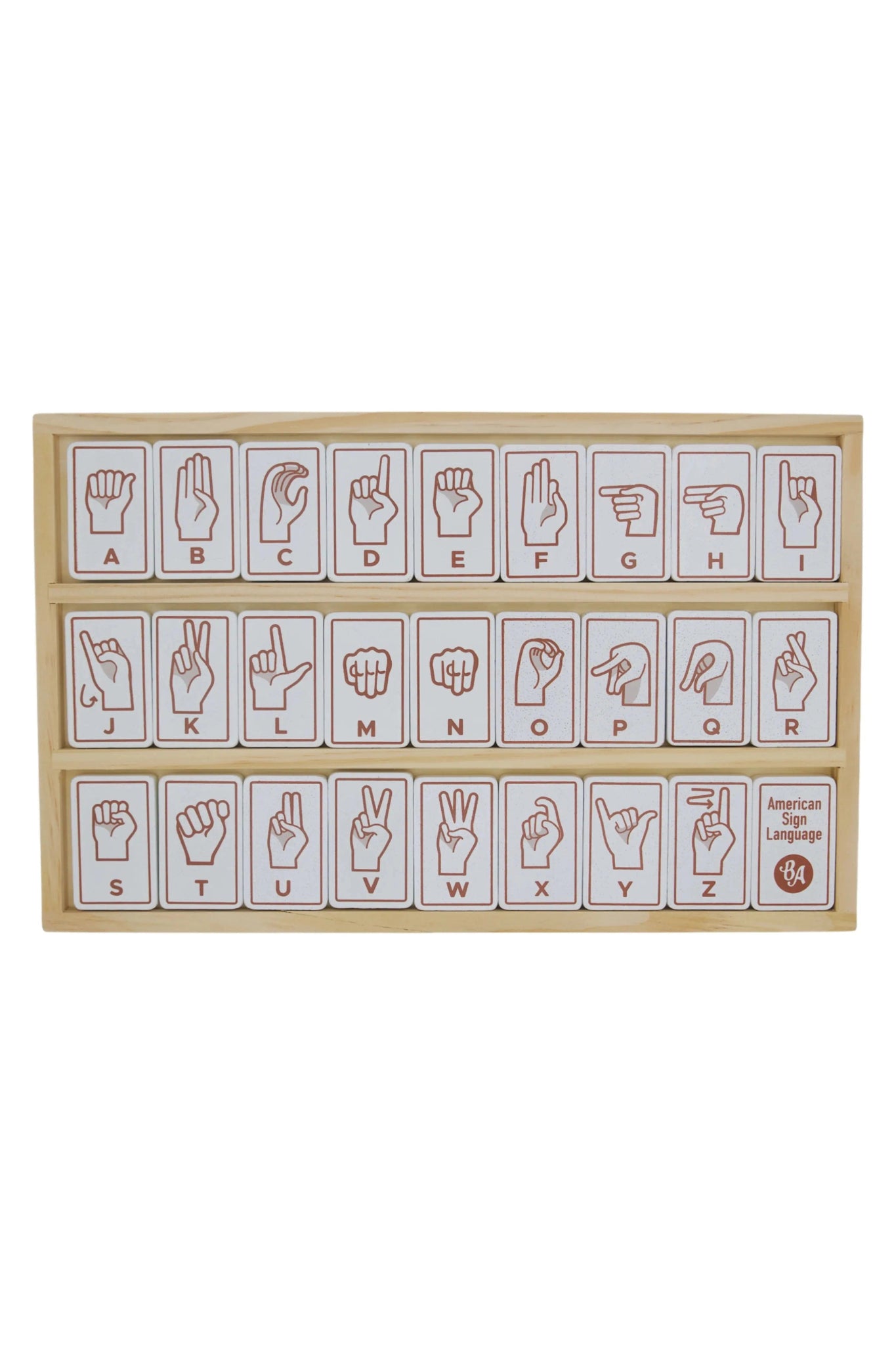 The 26 piece set features upper case and lower case letters on one side, and corresponding American hand sign language picture on the other for easy teaching.