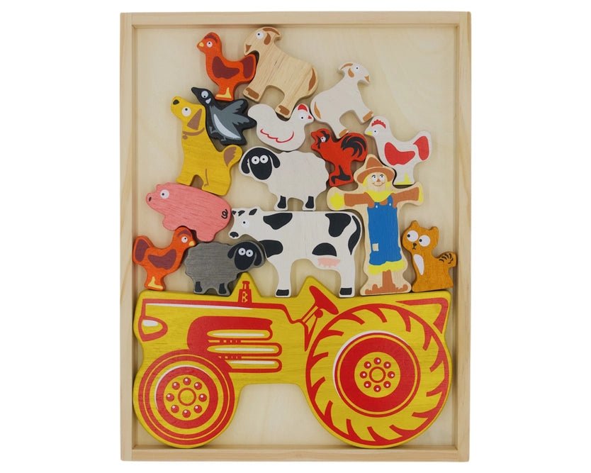 The Tractor Stacker is a family game and character playset all in one! With the Tractor Stacker game kids can develop dexterity, patience and pretend play skills. Inventing their own games and stories, kids will stack the brightly colored farm animals as high as they can, balancing them atop the 6"x10" wooden tractor. The farm animals are also perfect pocket pals, starring daily in pretend barnyard adventures.